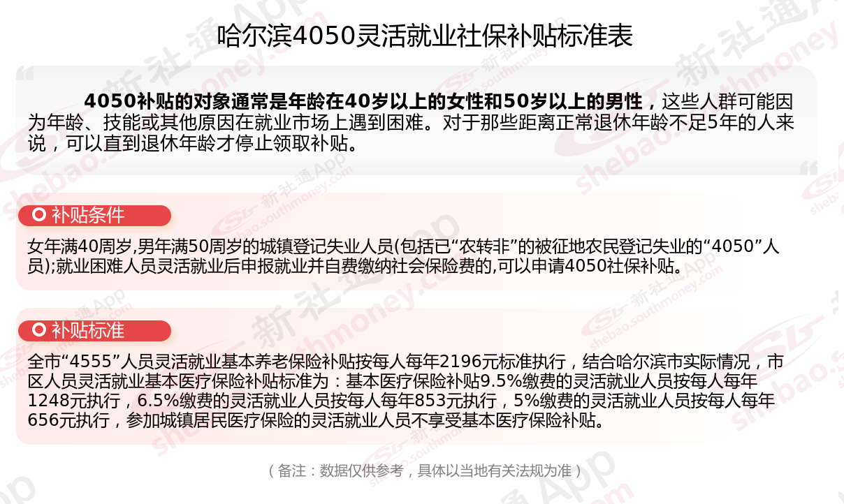 以上就是哈尔滨4050灵活就业社保补贴的相关内容,欢迎关注新社通/下载新社通APP了解更多五险一金专业资讯。