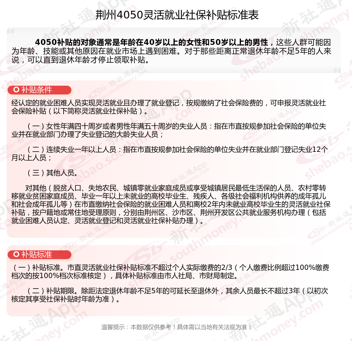 二、2025年荆州4050社保补贴标准及条件,最新如下: