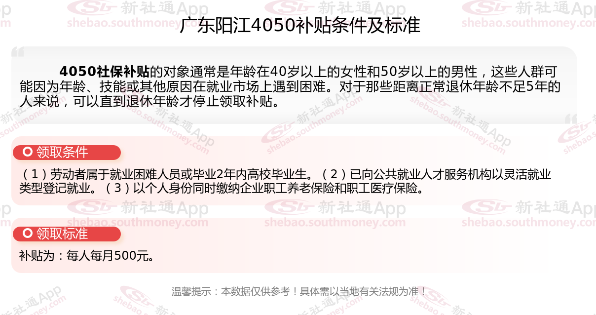 2025广东阳江4050补贴主要针对的是年龄在40岁以上的女性和50岁以上的男性,这些人群通常因为年龄较大而面临就业困难。