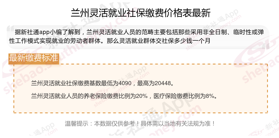 2025灵活就业社保缴费标准的调整,既体现了法规的连续性,又适应了经济社会发展的要求。灵活就业人员应根据自身情况,合理选择缴费基数和缴费比例,确保自身权益得到充分保证。那么2025年兰州灵活就业人员社保需要交多少钱?下面随新社通小编一起来看看。