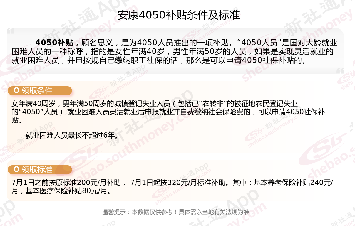 2025安康4050补贴主要针对的是年龄在40岁以上的女性和50岁以上的男性,这些人群通常因为年龄较大而面临就业困难。