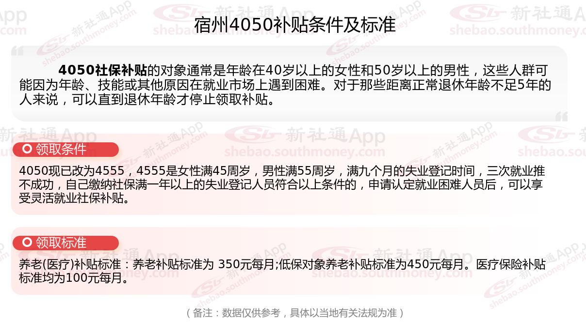 二、2025年宿州4050社保补贴标准是多少?领取条件是什么?