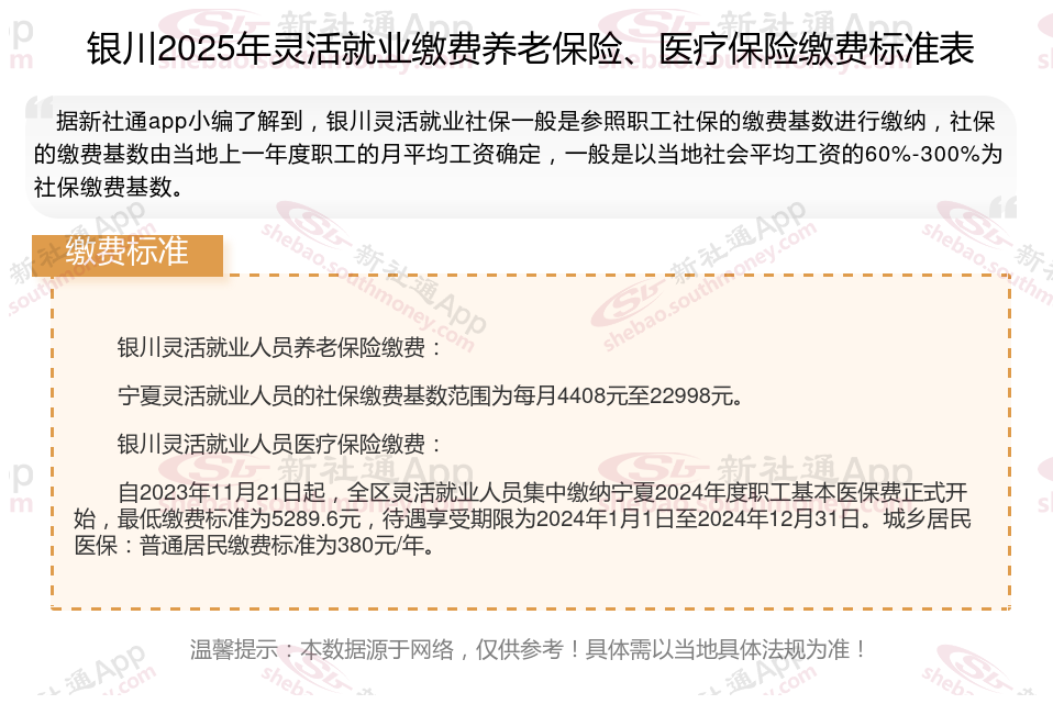 据新社通app数据显示,银川灵活就业人员养老缴费基数2024-2025年最新标准如下: