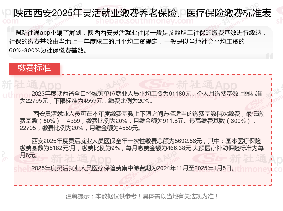 据新社通app数据显示,2024-2025年陕西西安灵活就业人员养老保险的缴费标准是根据缴费基数来确定的: