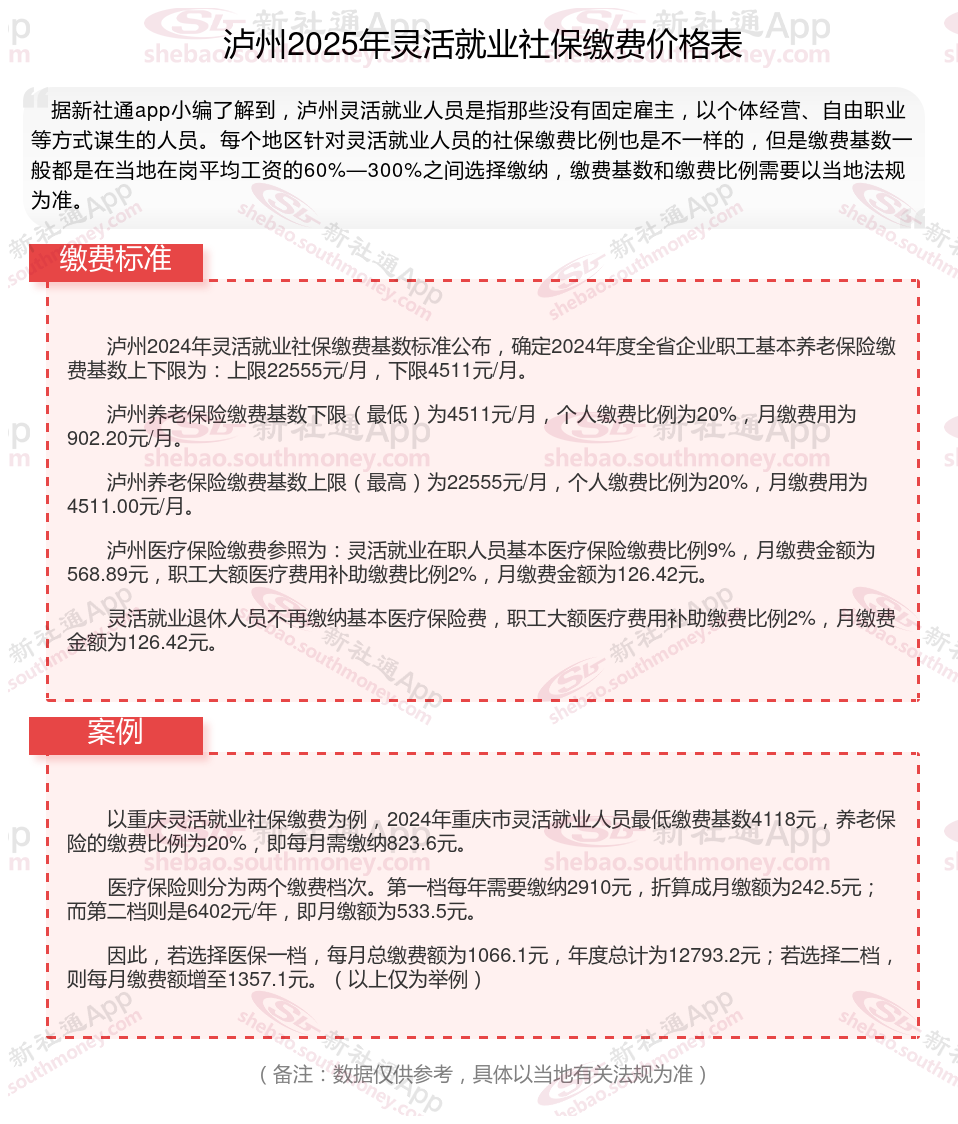 以上就是新社通小编带来泸州灵活就业社保缴费知识,内容供参考,希望对你有帮助,欢迎关注/下载新社通APP解锁更多社保专业资讯。
