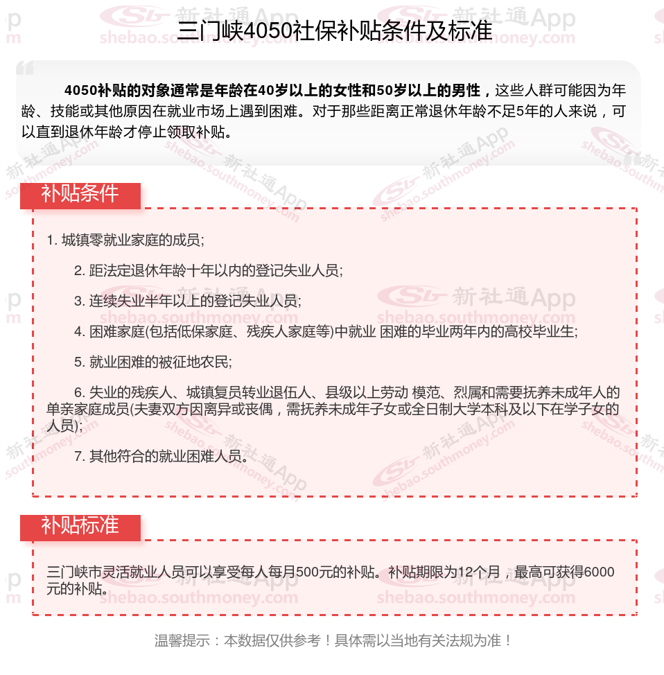 2025三门峡4050补贴主要针对的是年龄在40岁以上的女性和50岁以上的男性,这些人群通常因为年龄较大而面临就业困难。