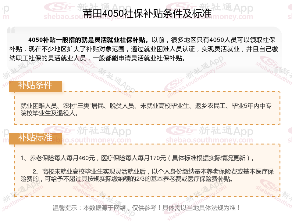 二、莆田4050社保补贴标准及条件2025年最新消息