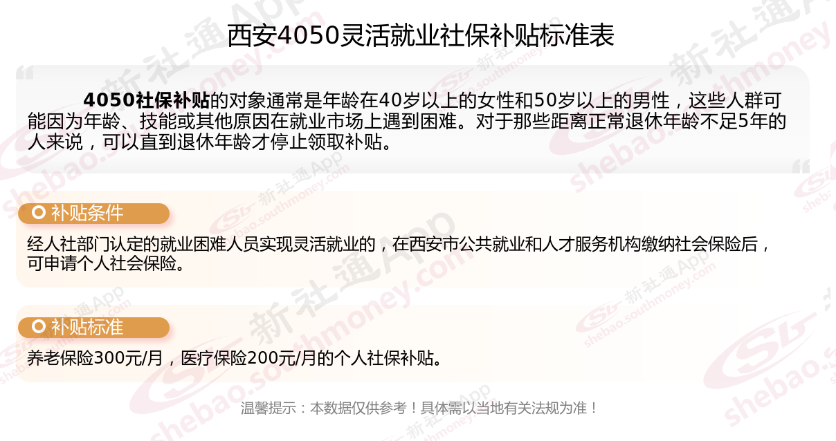 “4050人员”是国对大龄就业困难人员的一种称呼,指的是女性年满40岁,男性年满50岁的人员,那么西安4050灵活就业社保补贴标准是多少钱?西安4050社保补贴条件是什么?接下来随新社通APP小编了解一下最新资讯。