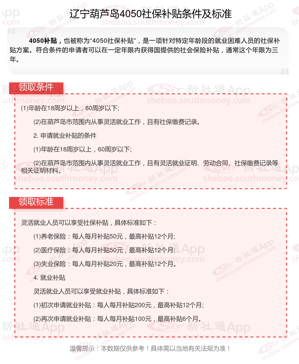 一、辽宁葫芦岛4050社保补贴标准及条件是多少?