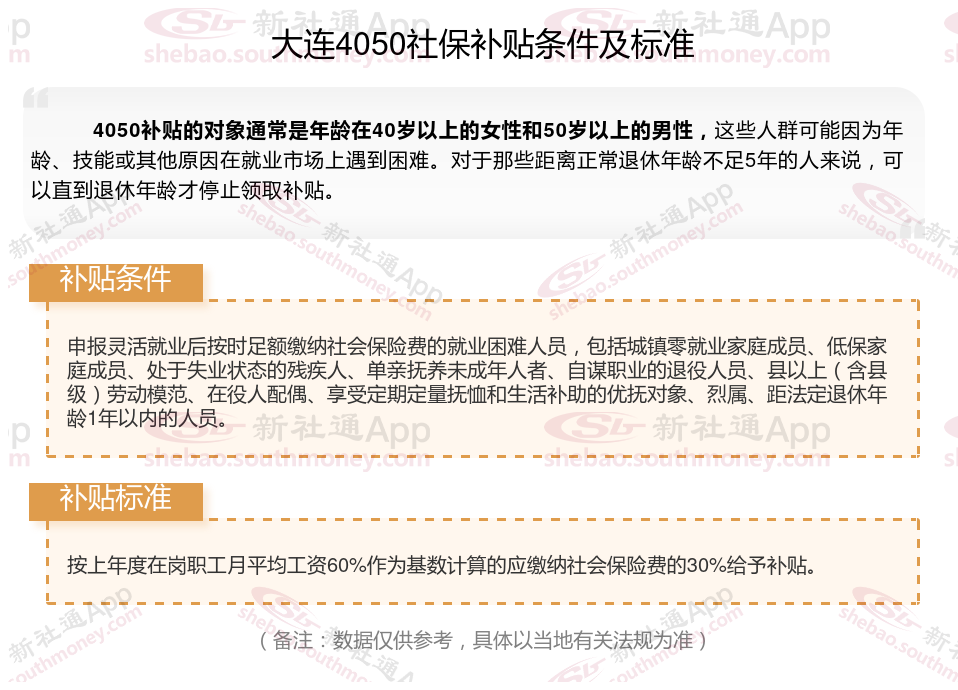 今天聊一下4050补贴话题。4050补贴听起来像是一个针对特定年龄人群的社保补贴。比如女性需年满40周岁,男性需年满50周岁(以申请当年12月31日为截止日期)。那么大连4050灵活就业社保补贴标准是多少钱?大连4050社保补贴条件是什么?接下来随新社通APP小编了解一下最新资讯。