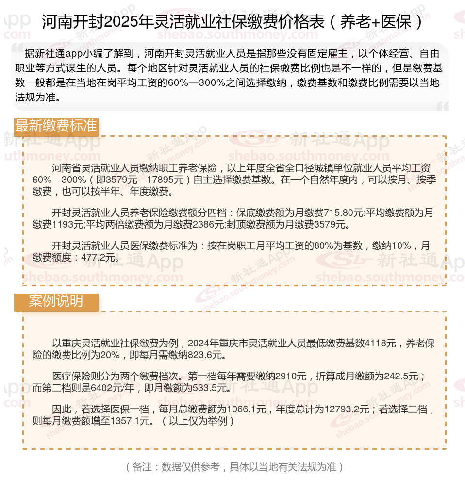 据新社通app数据显示,河南开封灵活就业养老保险缴费基数2024-2025年最新标准如下: