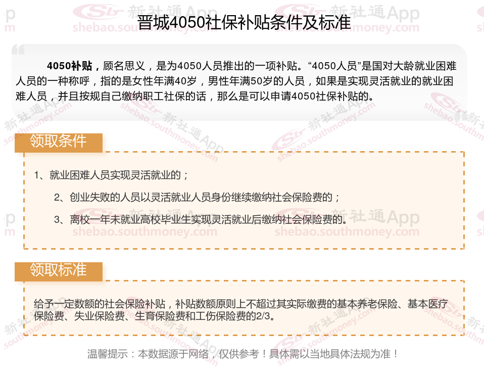 今天聊一下4050补贴的相关内容。4050补贴听起来像是一个针对特定年龄人群的社保补贴。比如女性需年满40周岁,男性需年满50周岁(以申请当年12月31日为截止日期)。那么晋城4050灵活就业困难人员社保补贴多少钱?晋城4050社保补贴可以申请吗?接下来随新社通APP小编具体了解一下4050社保补贴内容。
