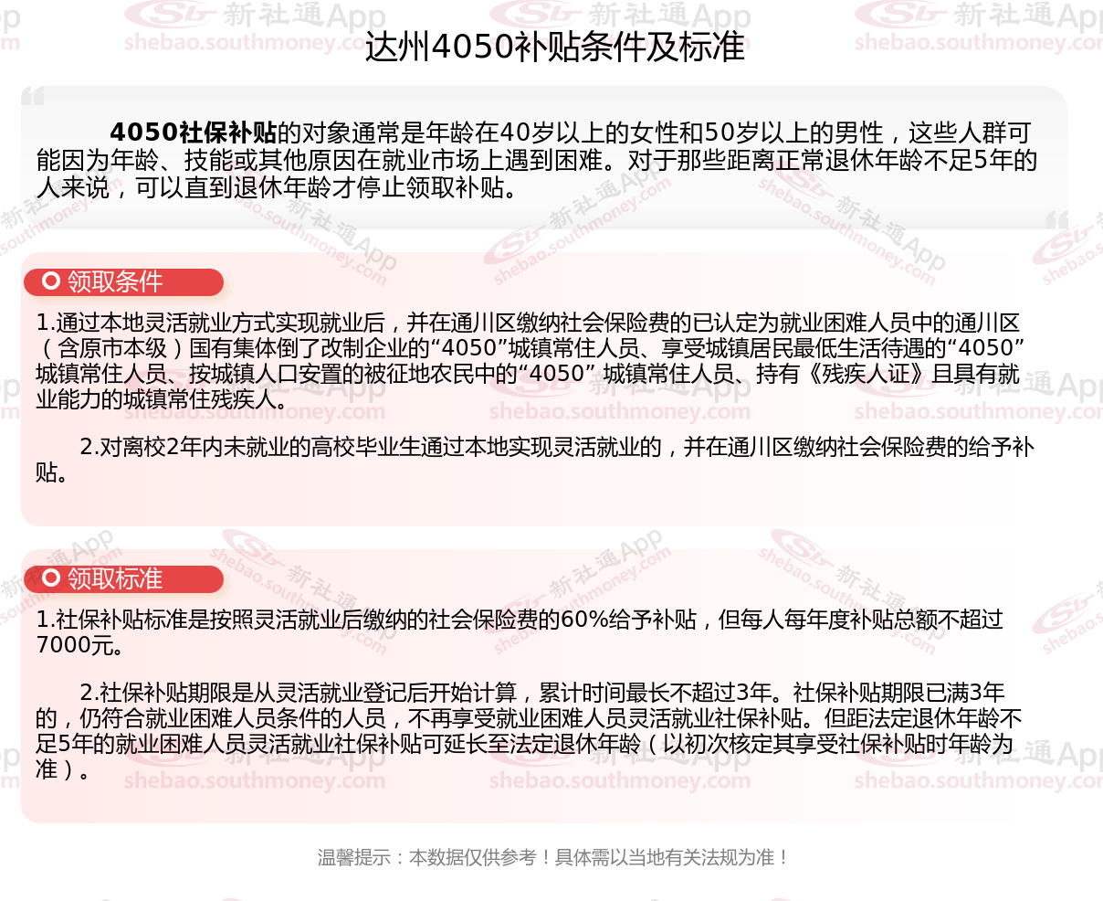 2025达州灵活就业4050社保补贴是一项面向特定年龄段的就业困难人群的社会保险补贴。