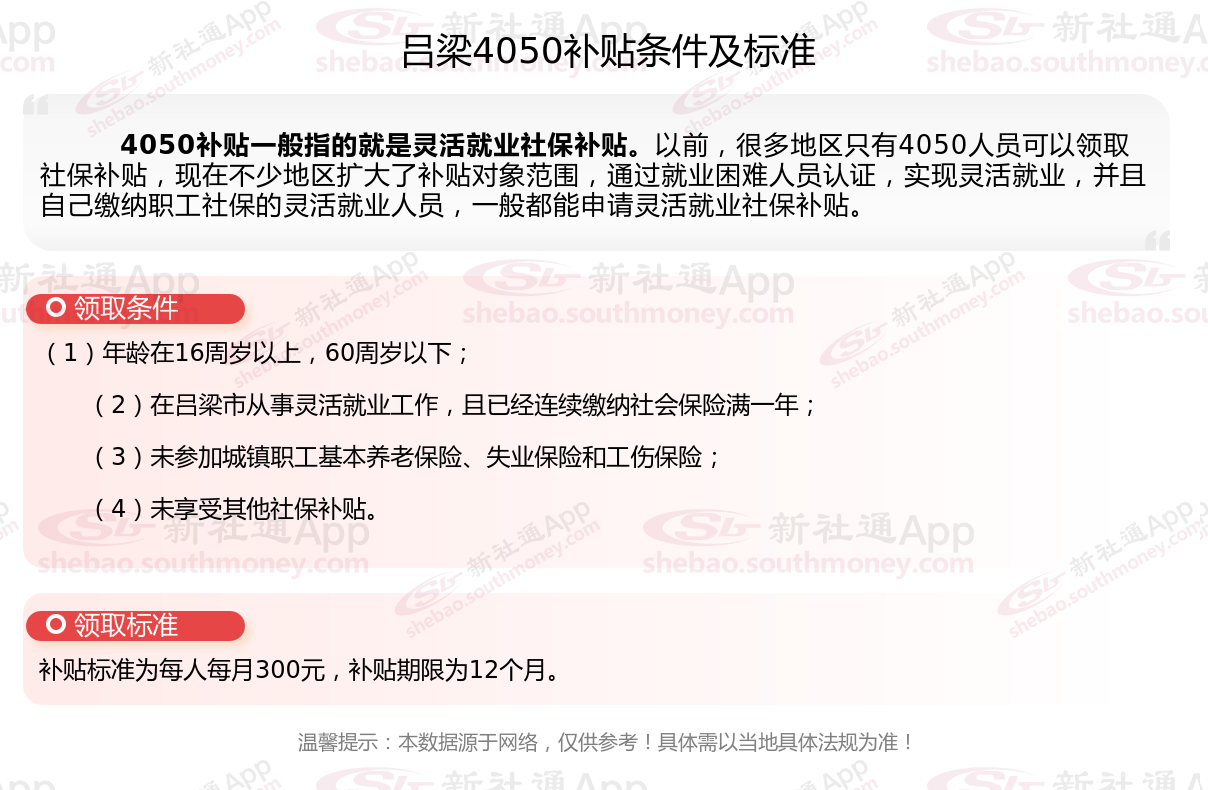 一、2025年吕梁4050社保补贴标准及条件是多少?