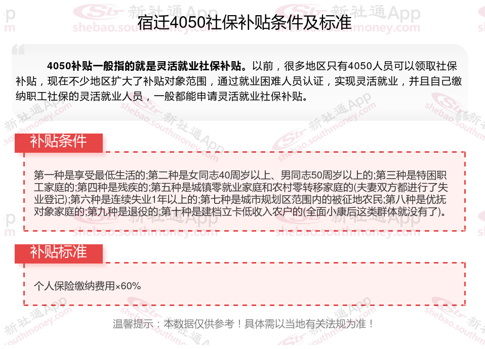 二、2025年宿迁4050社保补贴标准及条件是什么?