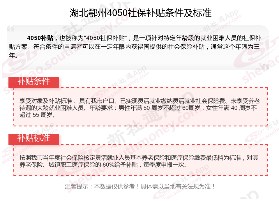 二、湖北鄂州4050社保补贴标准及条件2025年最新消息