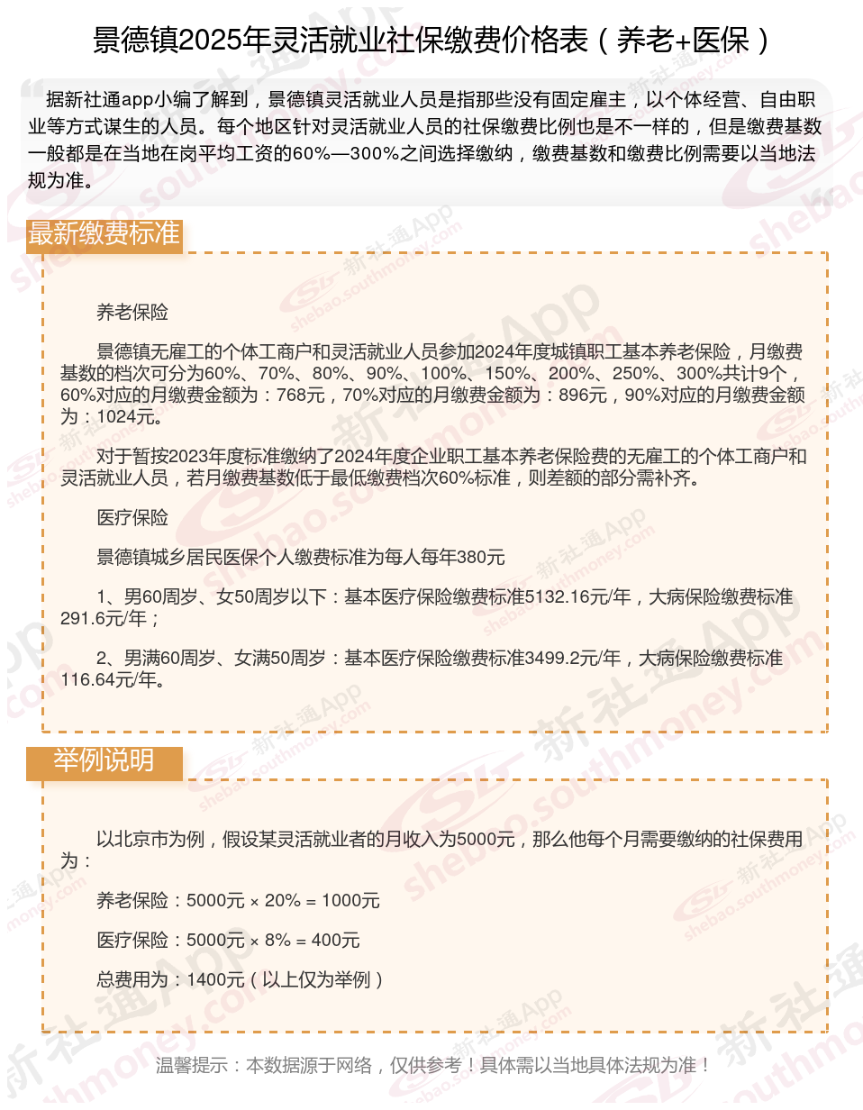 据新社通app数据显示,景德镇灵活就业养老保险缴费基数2024-2025年最新标准如下: