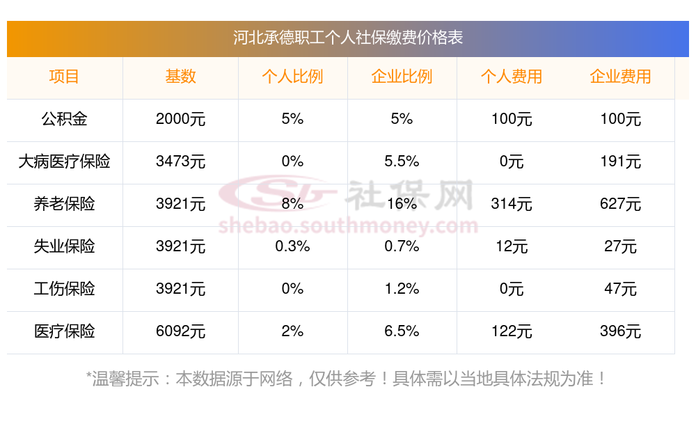 2025年河北承德社保缴费多少钱?下表是2024-2025年河北承德社保费用明细参考,新社通app-社保缴费查询工具提供的最新数据如下: