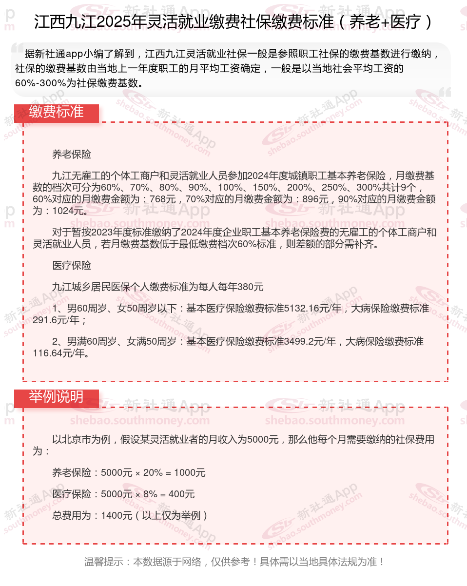 江西九江灵活就业自己交社保一个月要交多少钱?灵活就业人员社保缴费按什么档次缴纳好,怎么选择划算?根据新社通app-社保缴费查询工具提供的最新数据如下: