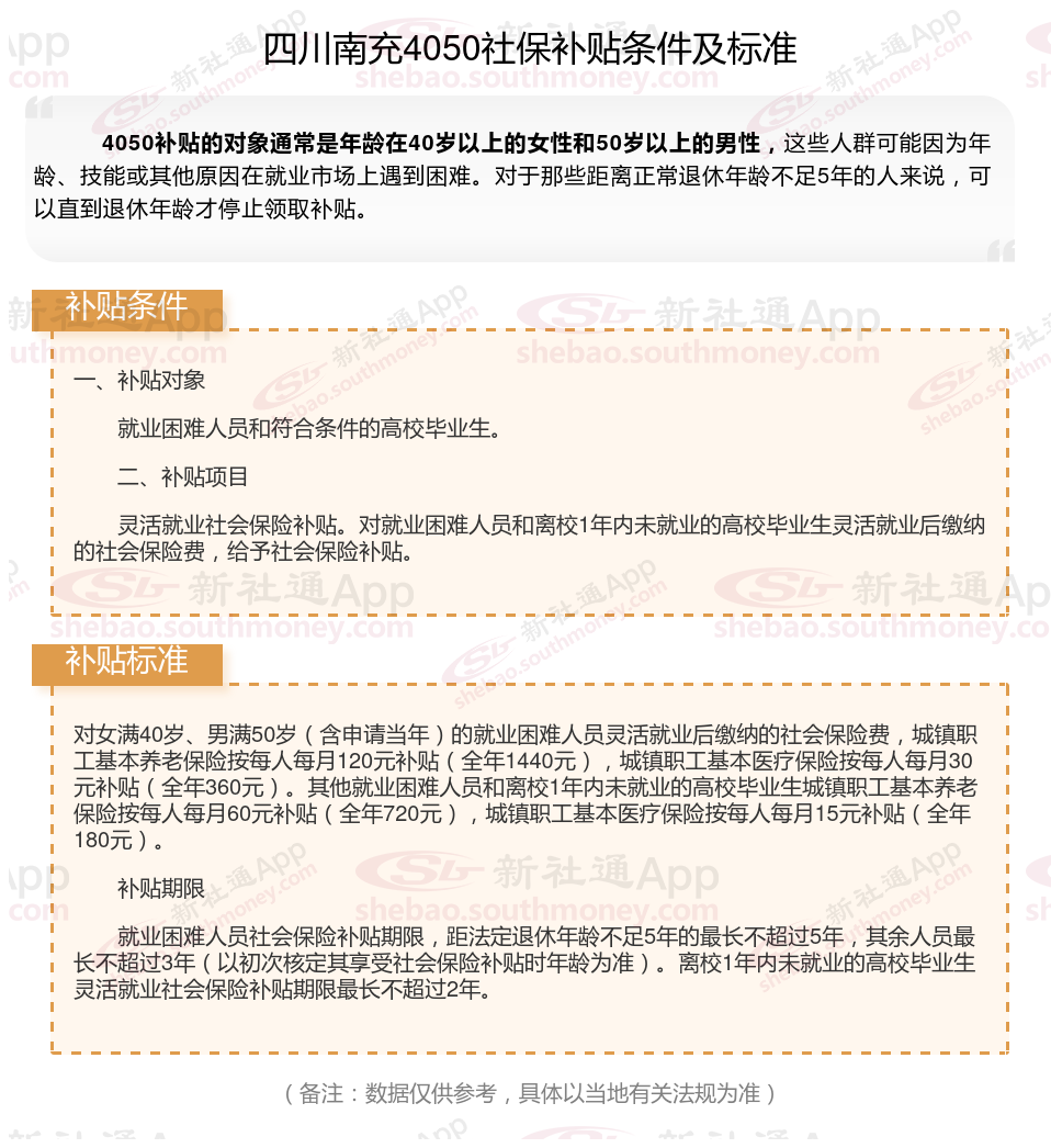 2025四川南充灵活就业4050社保补贴是一项面向特定年龄段的就业困难人群的社会保险补贴。