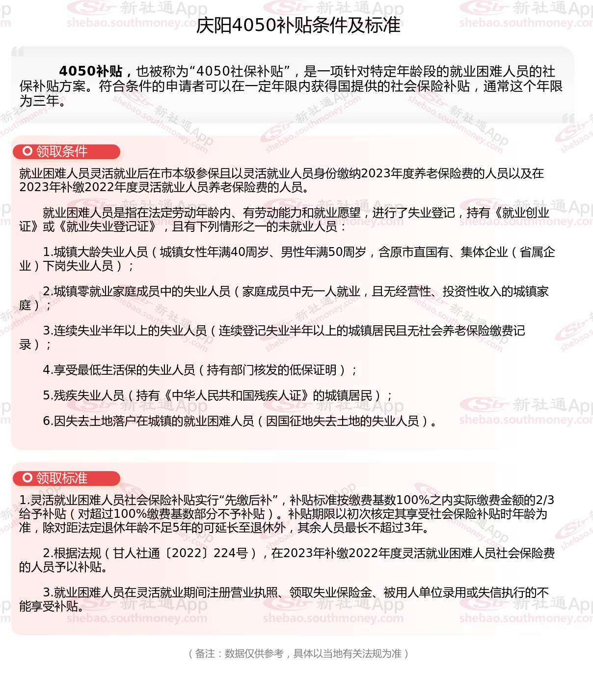 一、庆阳灵活就业4050社保补贴标准和条件是什么?