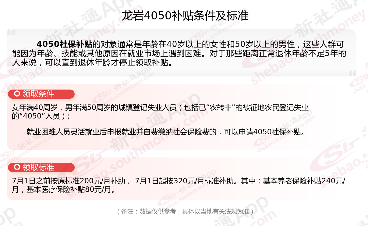 2025龙岩4050补贴主要针对的是年龄在40岁以上的女性和50岁以上的男性,这些人群通常因为年龄较大而面临就业困难。