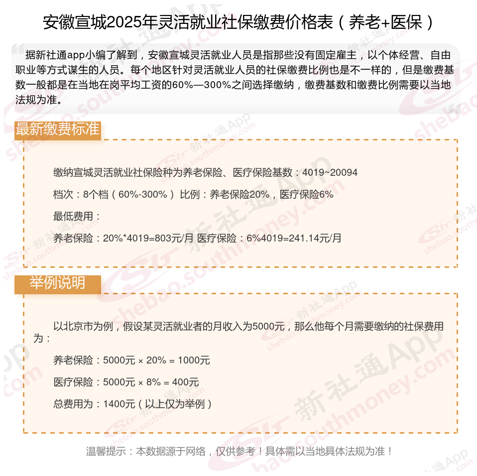 据新社通app数据显示,安徽宣城灵活就业养老保险缴费基数2024-2025年最新标准如下: