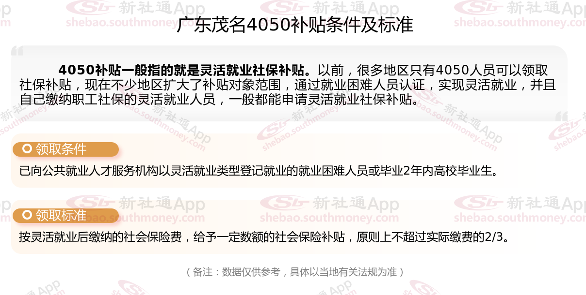 二、2025年广东茂名4050社保补贴标准及条件,最新如下: