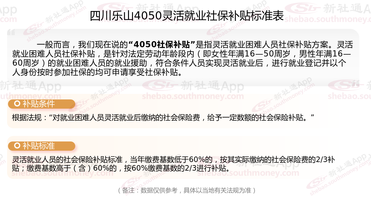 二、2025年四川乐山4050社保补贴标准(四川乐山4050灵活就业人员补贴标准是多少钱?四川乐山2025年4050补贴新规能领多少钱?)