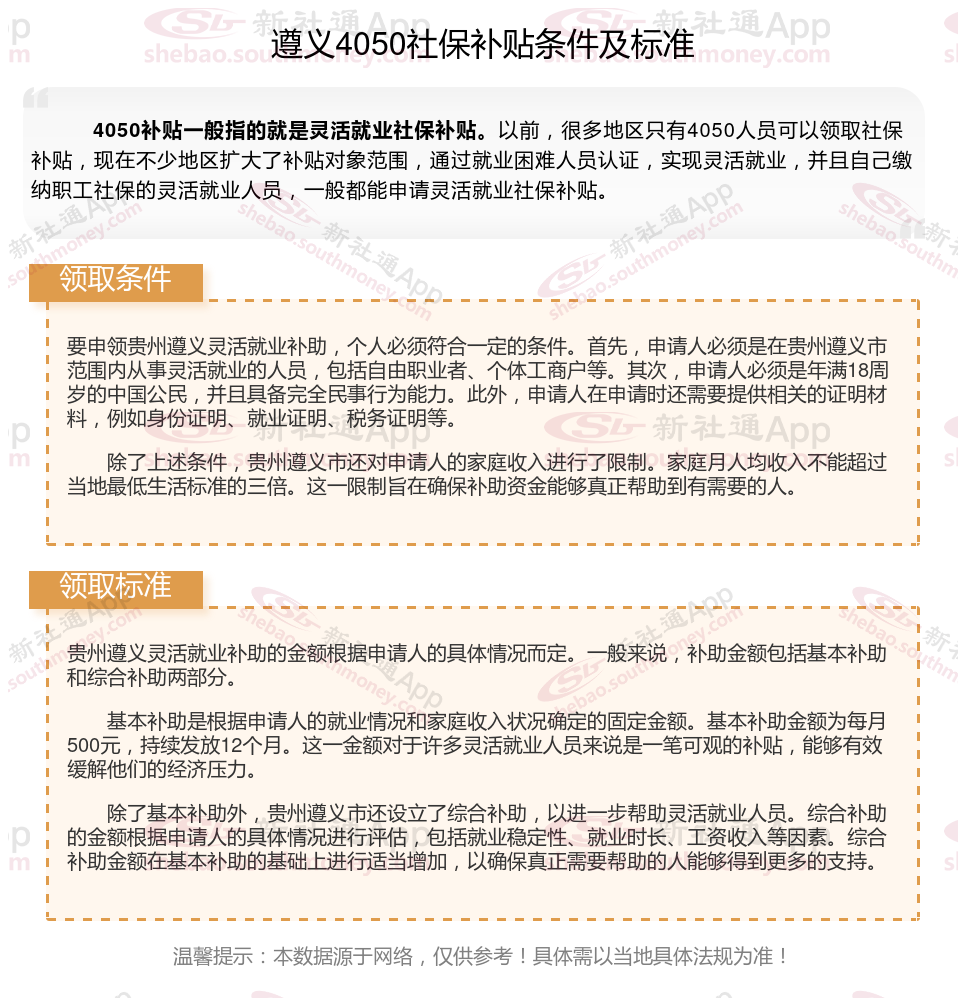以上就是遵义4050灵活就业社保补贴的相关内容,欢迎关注新社通/下载新社通APP了解更多五险一金专业资讯。