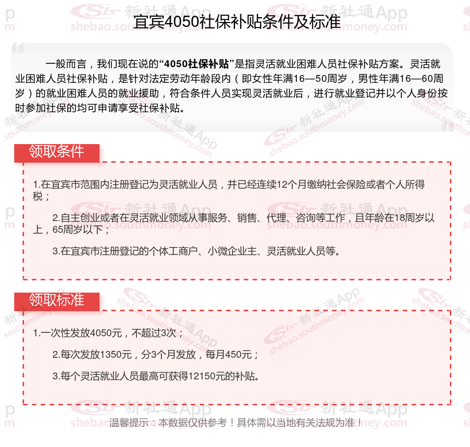今天聊一下4050补贴话题。4050补贴听起来像是一个针对特定年龄人群的社保补贴。比如女性需年满40周岁,男性需年满50周岁(以申请当年12月31日为截止日期)。那么宜宾4050灵活就业社保补贴标准是多少钱?宜宾4050社保补贴条件是什么?接下来随新社通APP小编了解一下最新资讯。