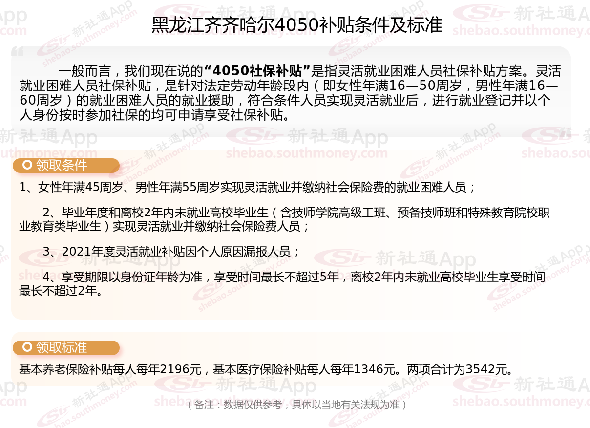 一、2023-2024年黑龙江齐齐哈尔4050社保补贴标准及条件,最新如下