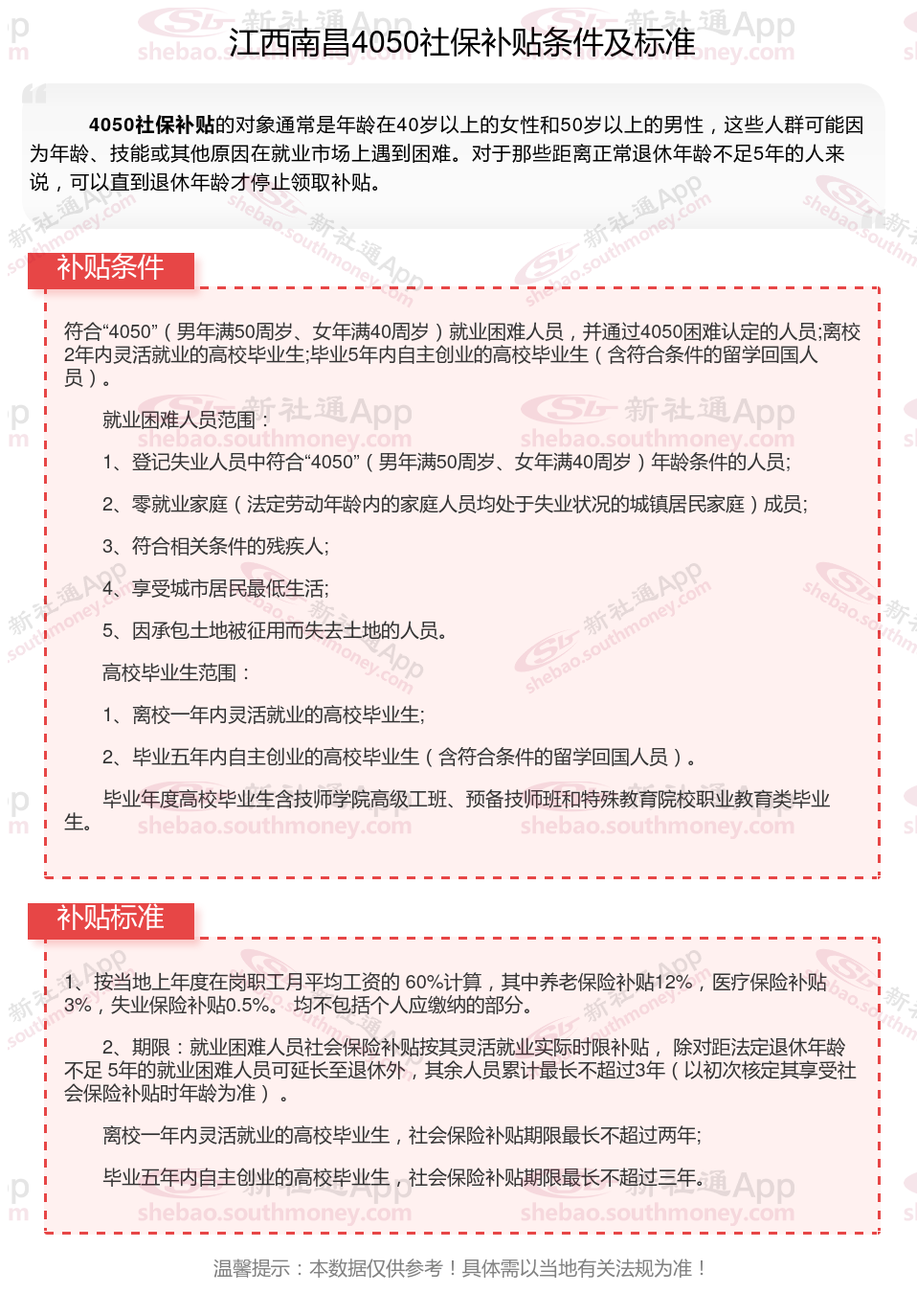 2025江西南昌4050补贴主要针对的是年龄在40岁以上的女性和50岁以上的男性,这些人群通常因为年龄较大而面临就业困难。