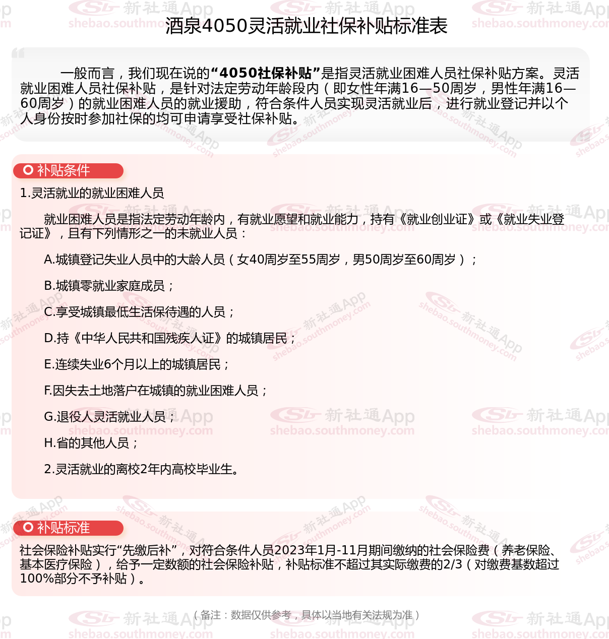 二、酒泉灵活就业4050社保补贴标准及条件是什么