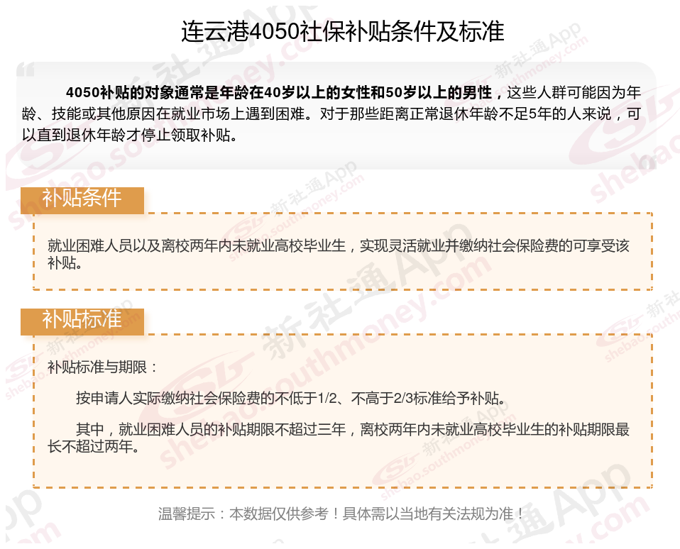 2025连云港4050补贴主要针对的是年龄在40岁以上的女性和50岁以上的男性,这些人群通常因为年龄较大而面临就业困难。