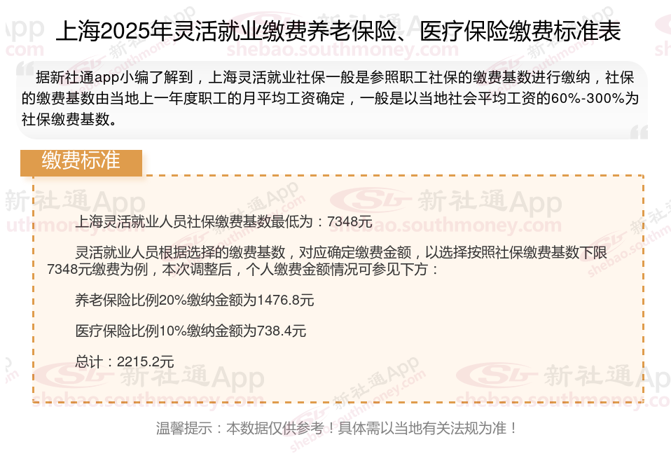 据新社通app数据显示,上海灵活就业人员养老保险缴费基数2024-2025年最新标准如下: