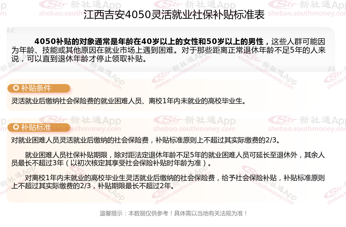 2025年江西吉安4050社保补贴新规 2025年江西吉安4050社保补贴标准及条件是什么?2025江西吉安4050补贴主要针对的是年龄在40岁以上的女性和50岁以上的男性,这些人群通常因为年龄较大而面临就业困难。