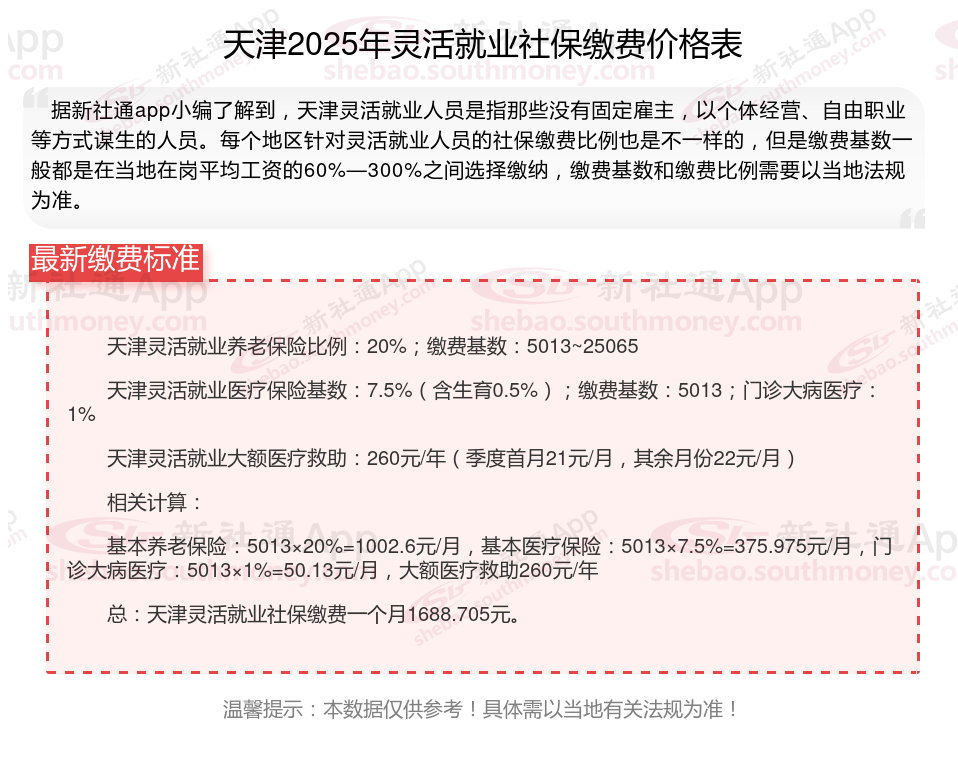 据新社通app数据显示,天津灵活就业养老保险最低缴费基数为:5013元;个人的缴费比例分别为:20%;