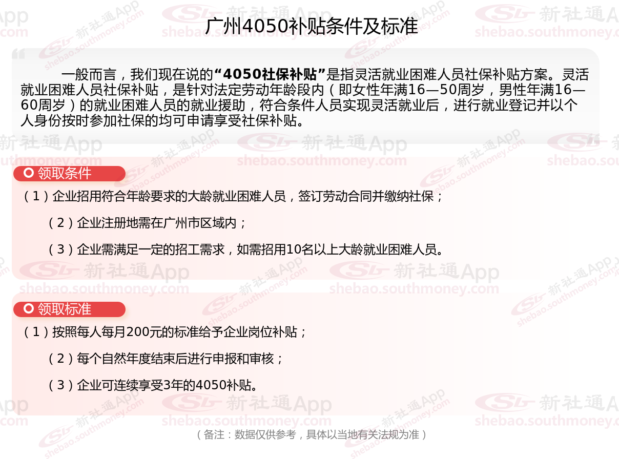 广州4050灵活就业社保补贴是什么?今天聊一下4050补贴话题。4050补贴听起来像是一个针对特定年龄人群的社保补贴。比如女性需年满40周岁,男性需年满50周岁(以申请当年12月31日为截止日期)。那么广州4050灵活就业社保补贴标准是多少钱?广州4050社保补贴可以领取多少?接下来随新社通APP小编了解一下广州4050灵活就业社保补贴的最新资讯。