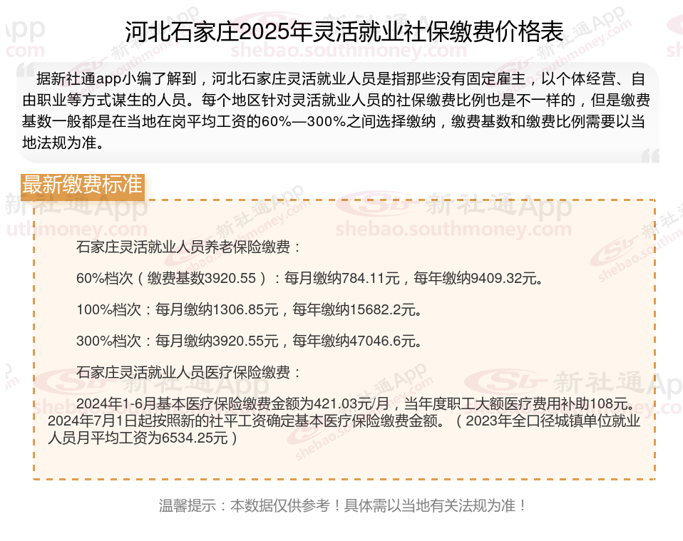 据新社通app数据显示,河北石家庄灵活就业养老保险缴费基数2024-2025年最新标准如下: