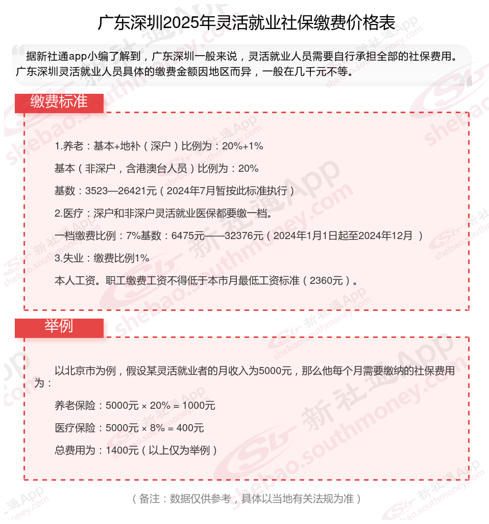 广东深圳灵活就业社保2025年收费标准是多少钱,主要由当地的在岗平均工资和缴费基数来定。其次,灵活就业社保缴纳跟职工缴纳不同的地方在于,灵活就业社保参保只能参保养老保险和医疗保险,且缴纳比例完全由个人承担。另外,灵活就业人员社保参保选择,可自由选择参保城镇职工社保和城乡居民保险。2025年广东深圳灵活就业社保缴多少钱?如何缴纳?怎么计算待遇?新社通APP小编将在下文为您详细说明。