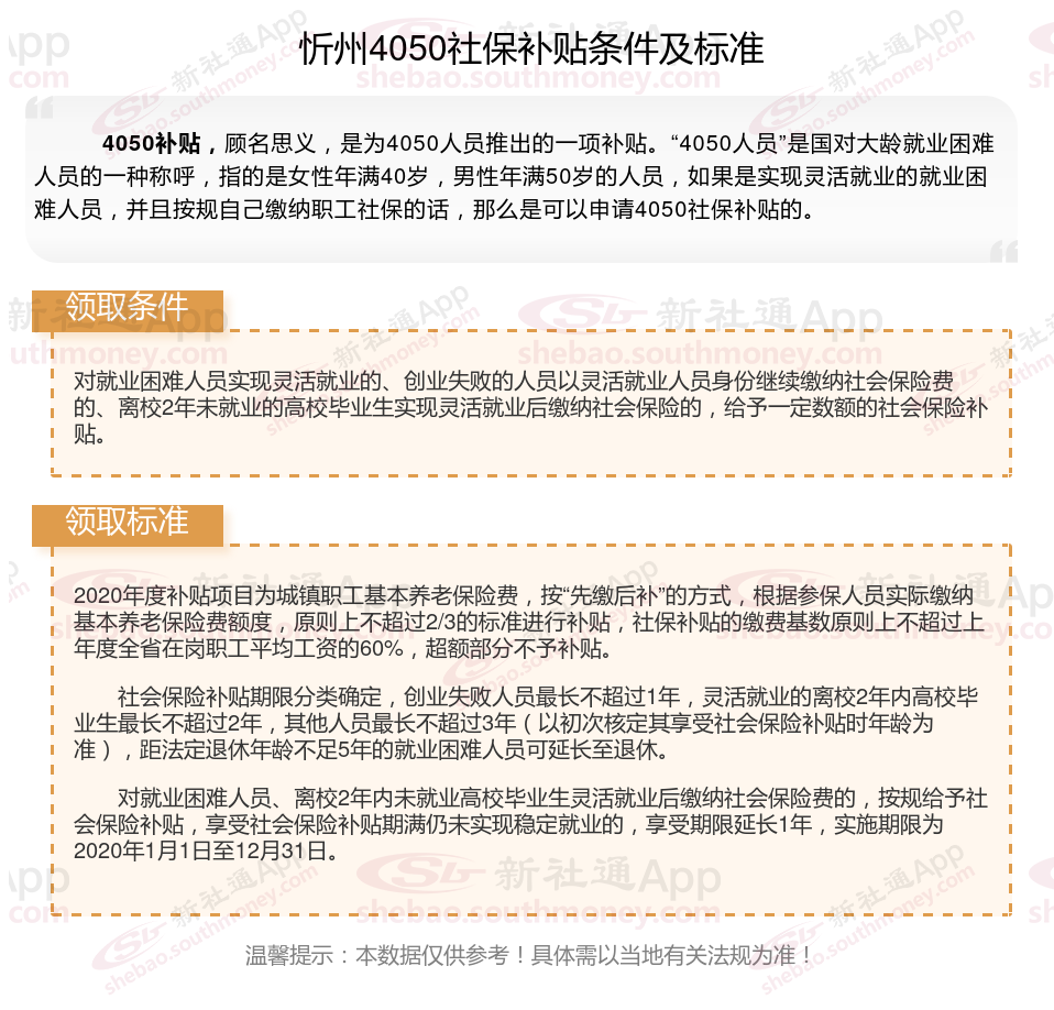 二、2025年忻州4050社保补贴标准是多少?领取条件是什么?