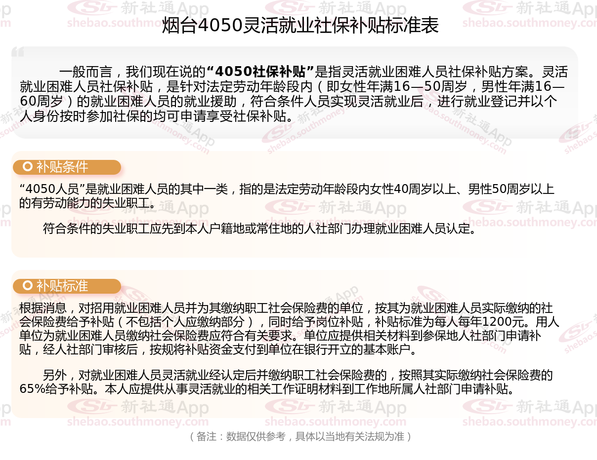 二、2025年烟台4050社保补贴标准及条件,最新如下: