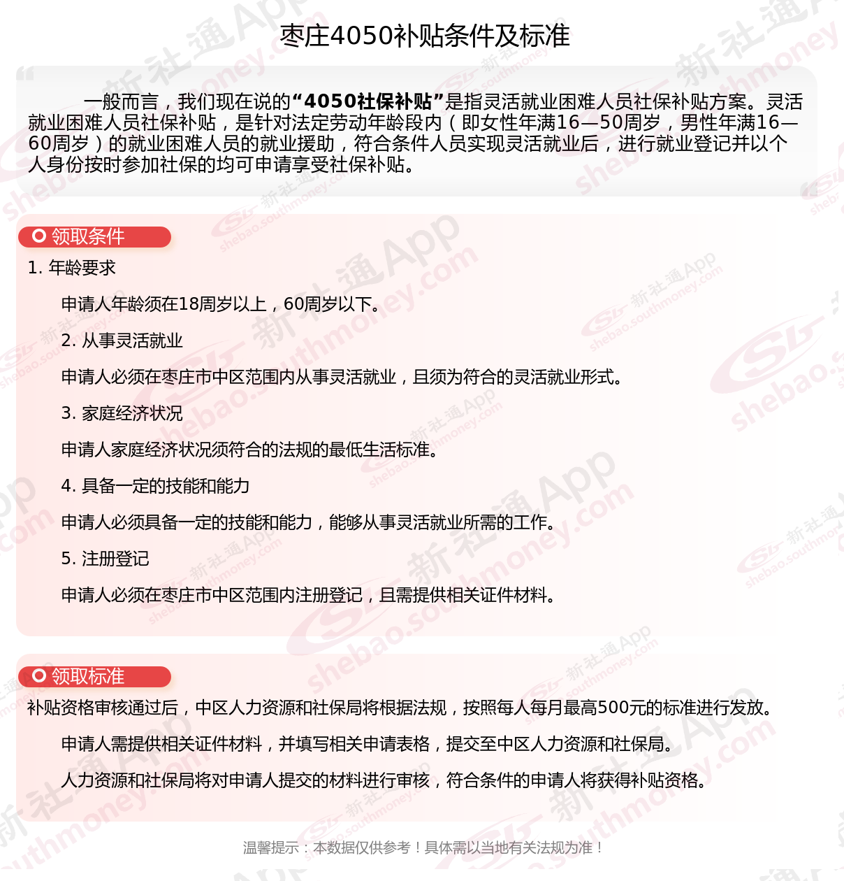 二、2025年枣庄4050社保补贴标准及条件,最新如下: