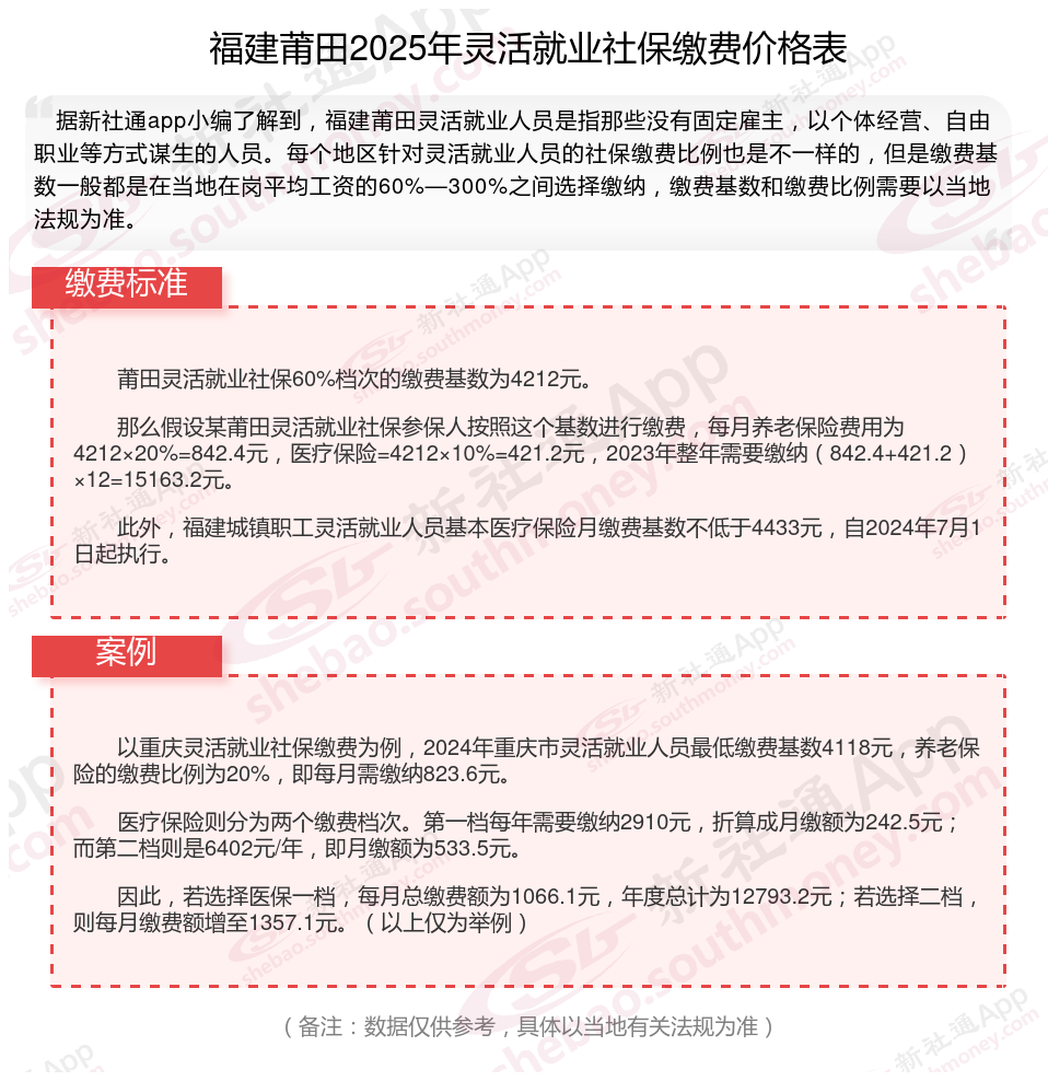 社保能抵御疾病、失业、养老等重大风险,避免陷入经济困境。也能享受医保报销、养老金增长等红利。社保是劳动者的法定权利,断缴可能影响购房、落户、子女教育等。那么2025年福建莆田灵活就业人员社保需要交多少钱?灵活就业人员社保缴费标准是多少?下面随新社通小编一起来看看。