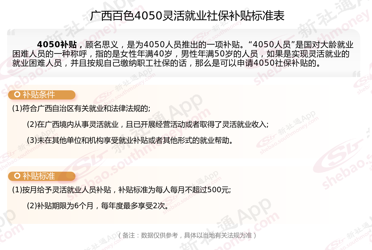 以上就是广西百色4050灵活就业社保补贴的相关内容,欢迎关注新社通/下载新社通APP了解更多五险一金专业资讯。