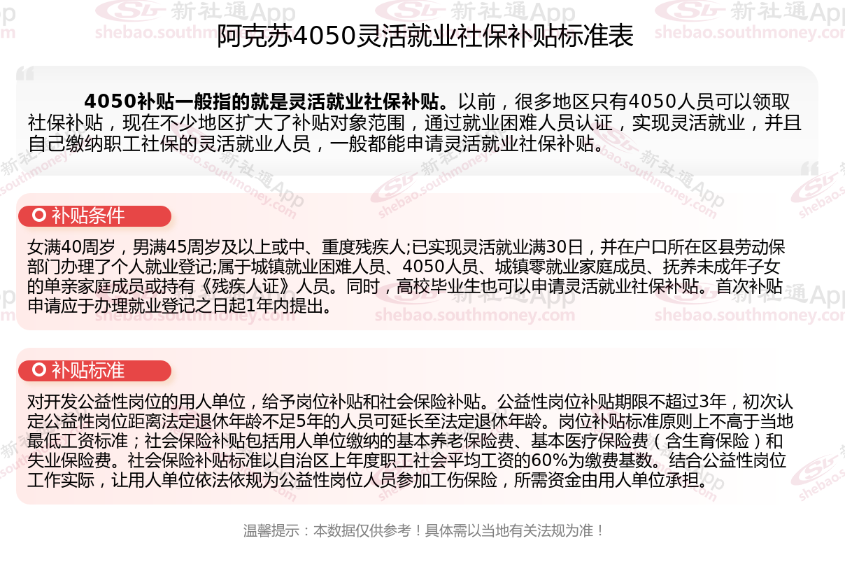 二、2025年阿克苏4050社保补贴标准(阿克苏4050灵活就业人员补贴标准是多少钱?阿克苏2025年4050补贴新规能领多少钱?)