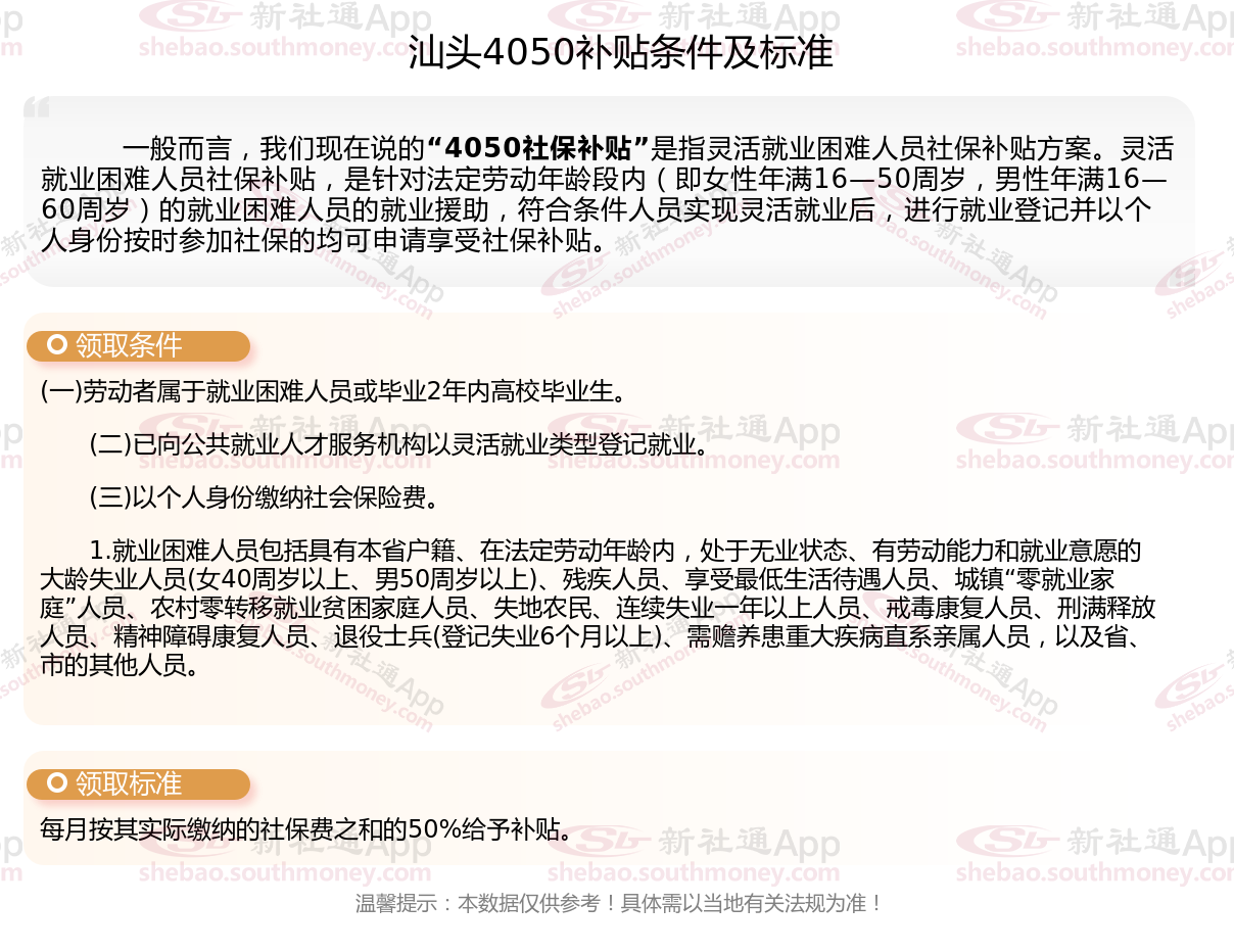 二、2025年汕头4050社保补贴标准及条件是什么?