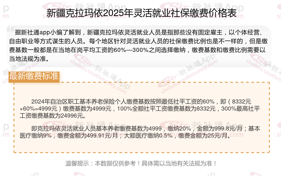 2025年新疆克拉玛依城镇职工社会保险缴费基数用人单位及其职工(包括有雇工的个体工商户及其雇工)分别按2024年度全口径省平的60%(4999元/月)和300%(24996元/月)核定缴费基数的下限和上限执行。