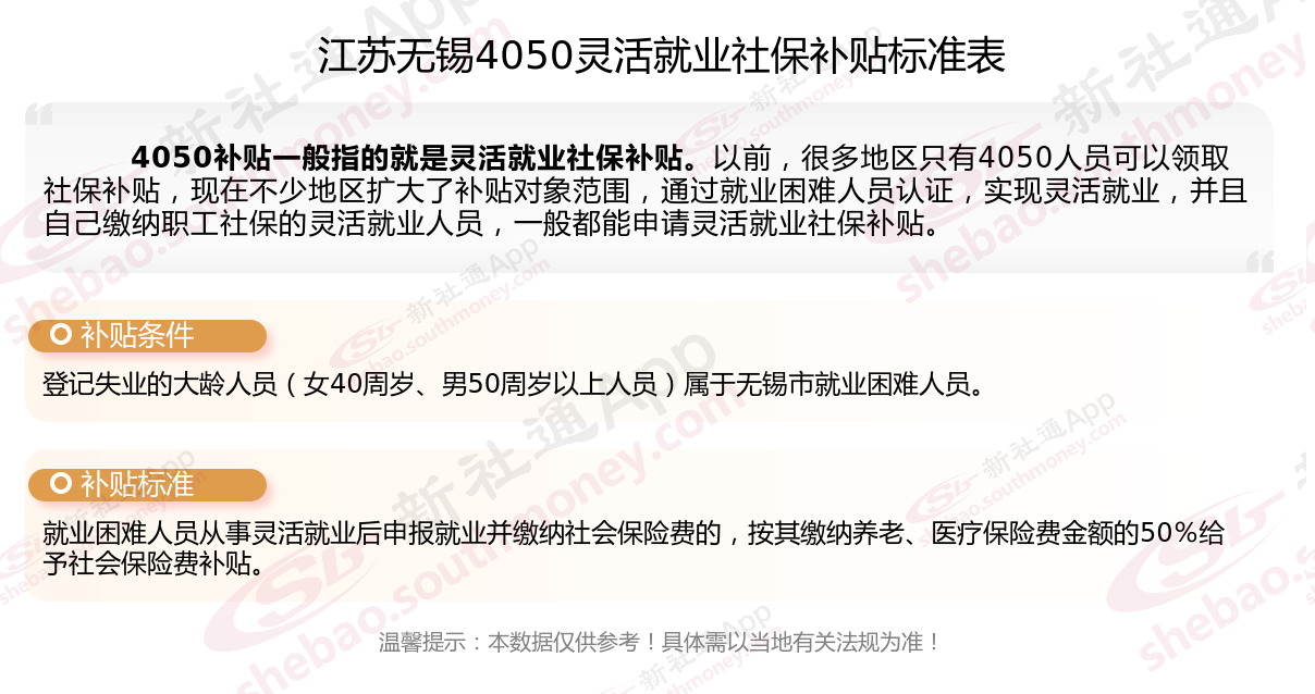 2025江苏无锡灵活就业4050社保补贴是一项面向特定年龄段的就业困难人群的社会保险补贴。